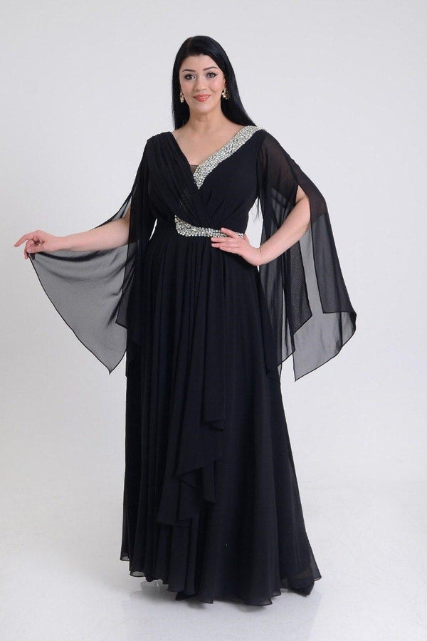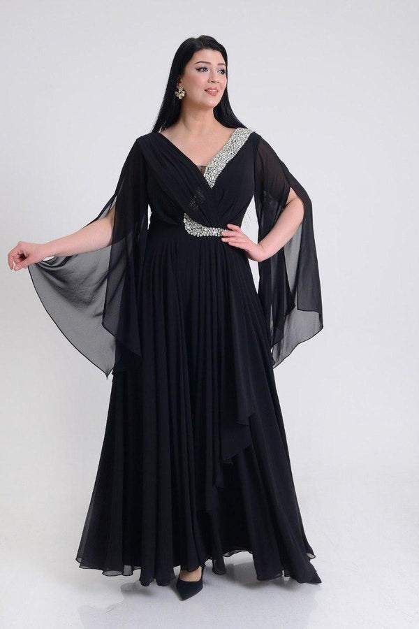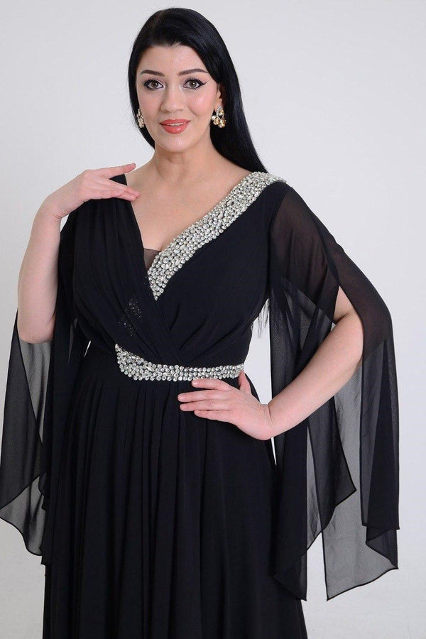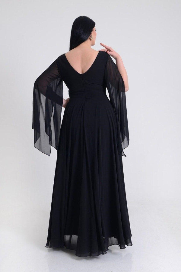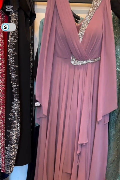 Wrap-style bodice with a V-neckline, short flutter sleeves, fitted waist, and a flowing skirt. The dress catches light, perfect for formal events or special occasions.